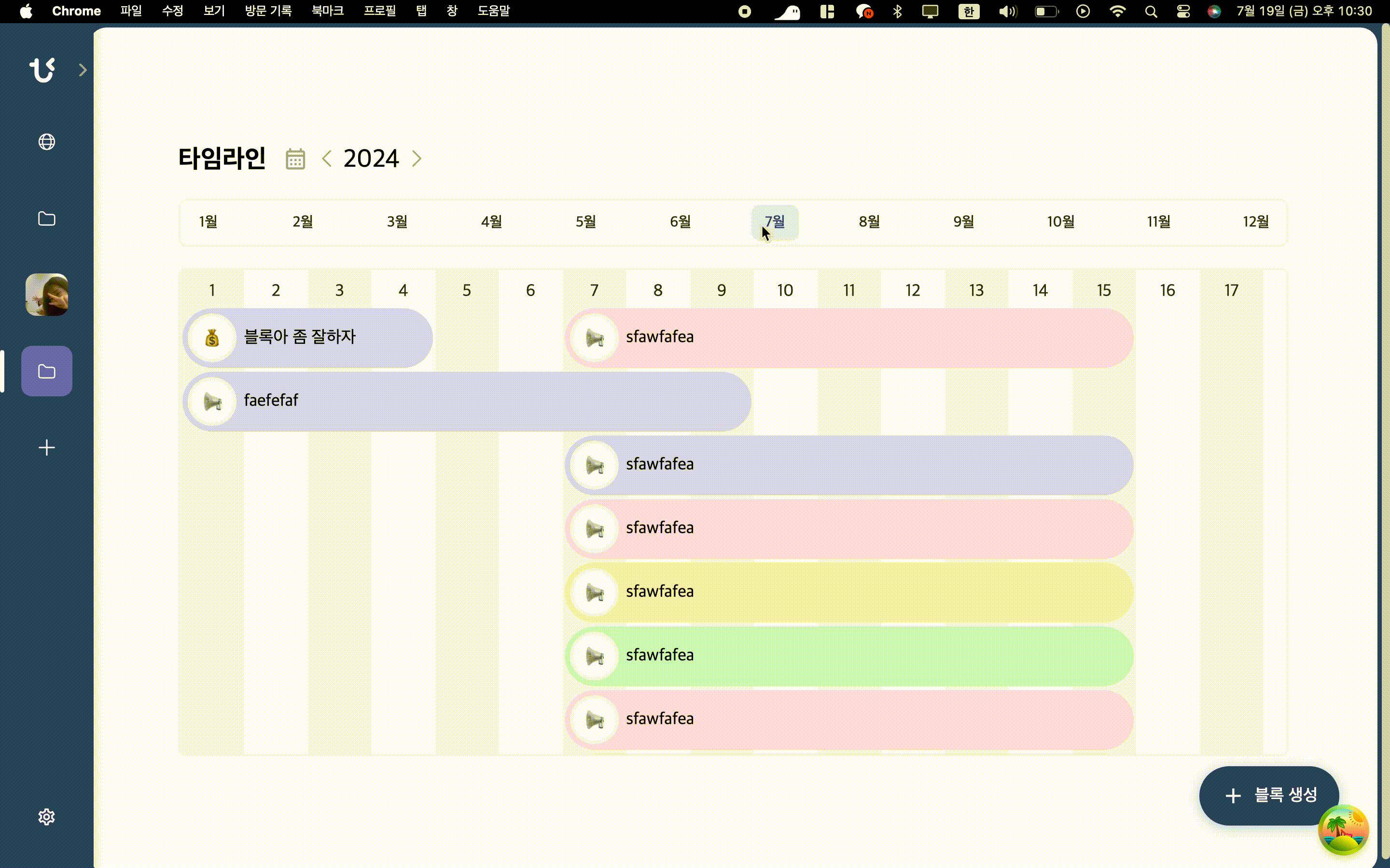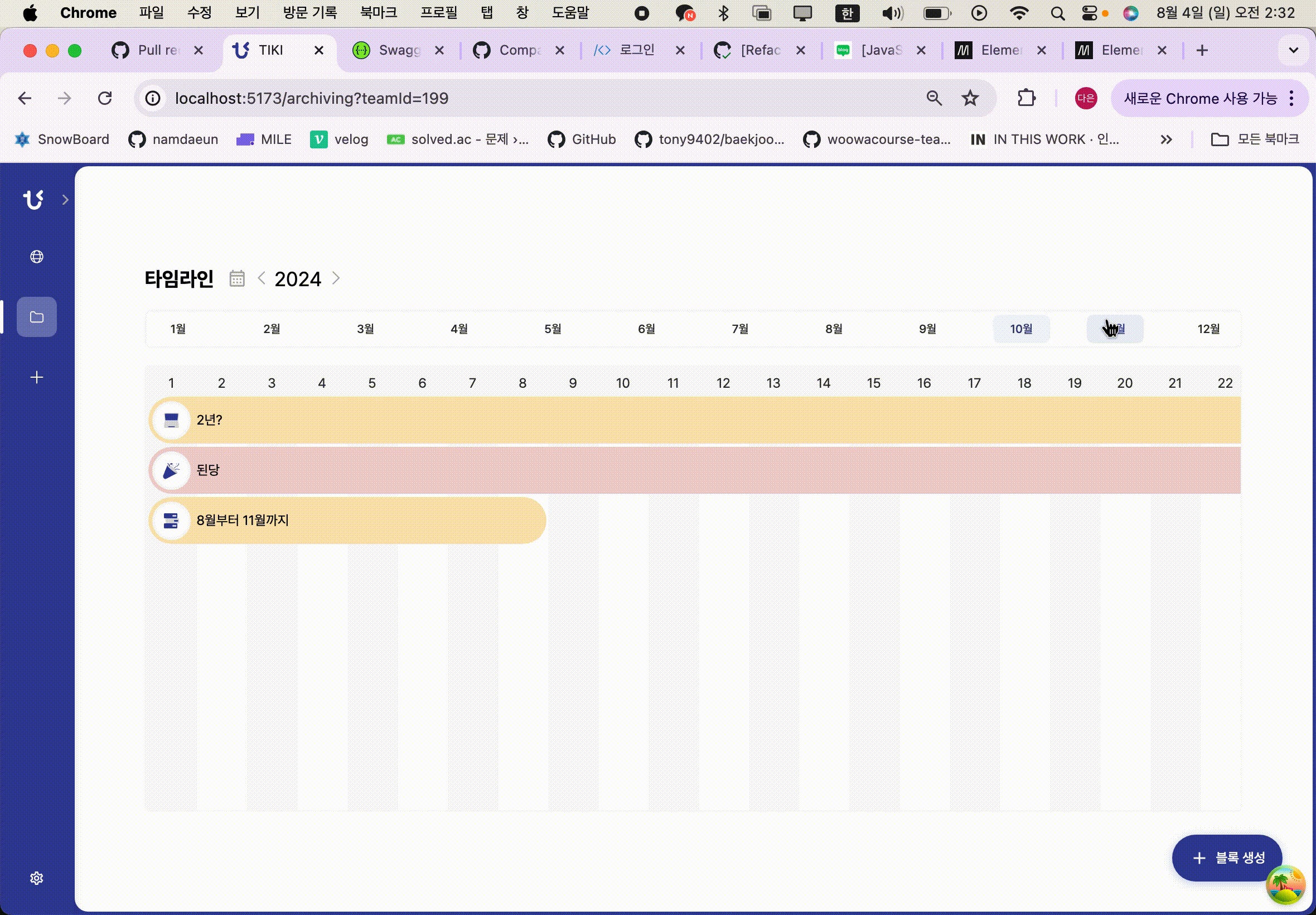 타임라인을 구현하면서 특히 신경 쓴 부분은 **"기간이 겹치는 블록을 어떻게 자연스럽게 쌓을까"**였어요.